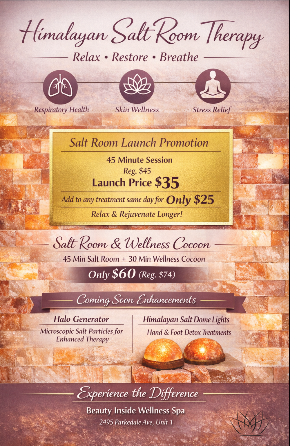 Includes 1 complimentary 45 minute Himalayan Salt Room session