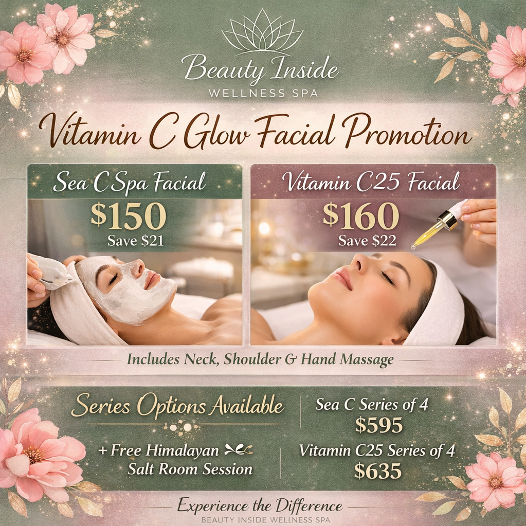 If your skin is feeling dull, tired or lacking its natural glow, our Vitamin C facials are designed to refresh, energize and visibly improve your complexion while still giving you the relaxation experience you expect at Beauty Inside Wellness Spa.